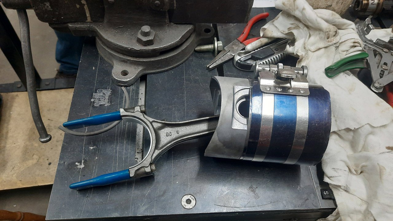 Ścisnąłem pierścienie przyrządem i założyłem gumki ochraniające śruby korbowodu.