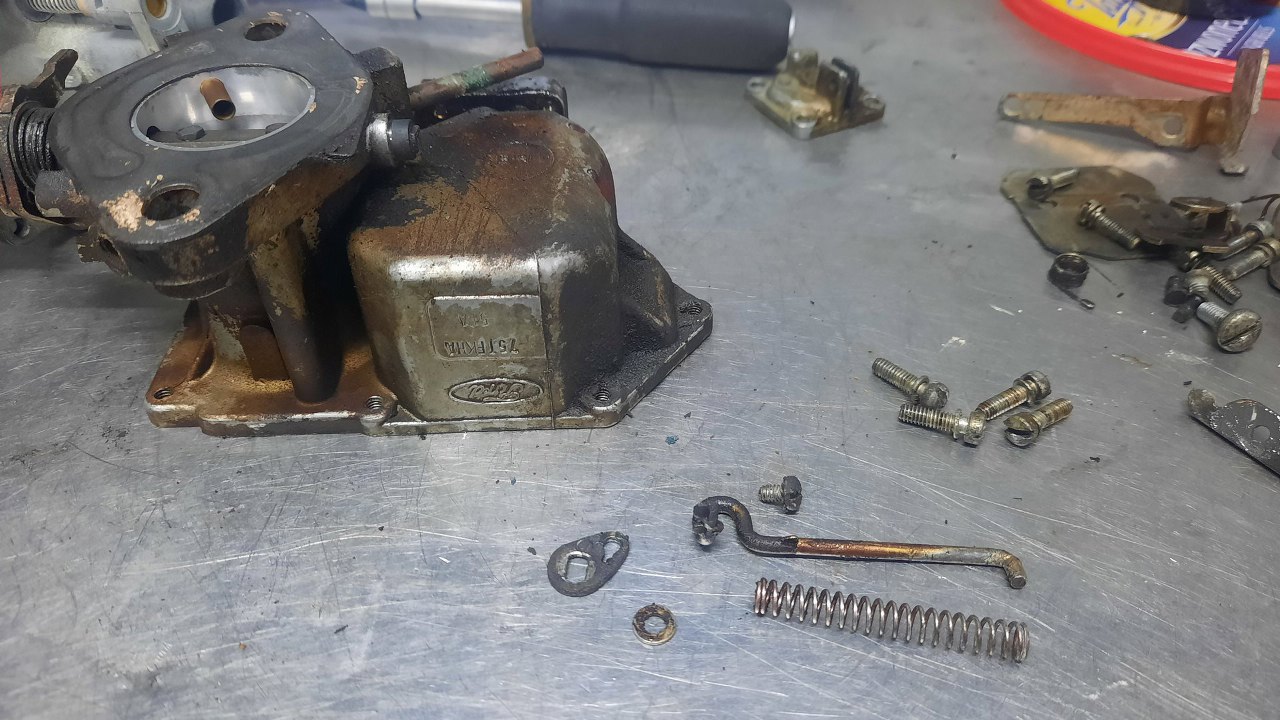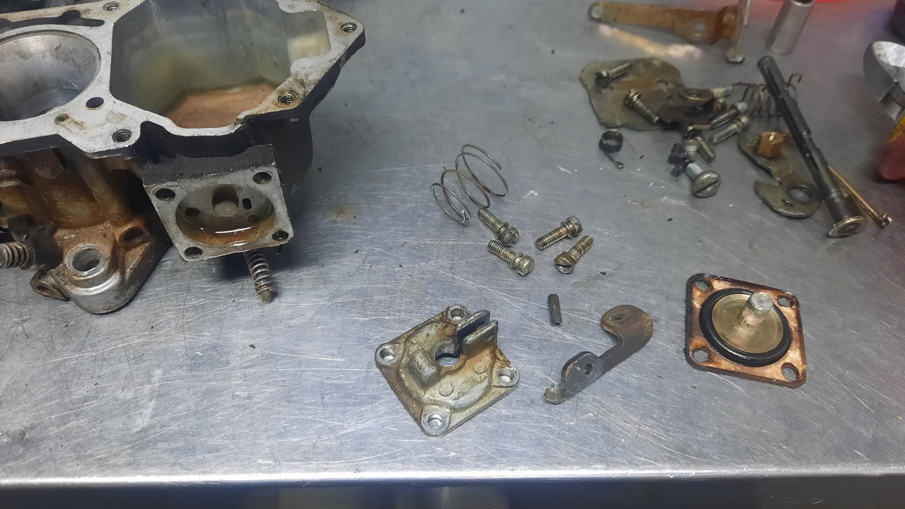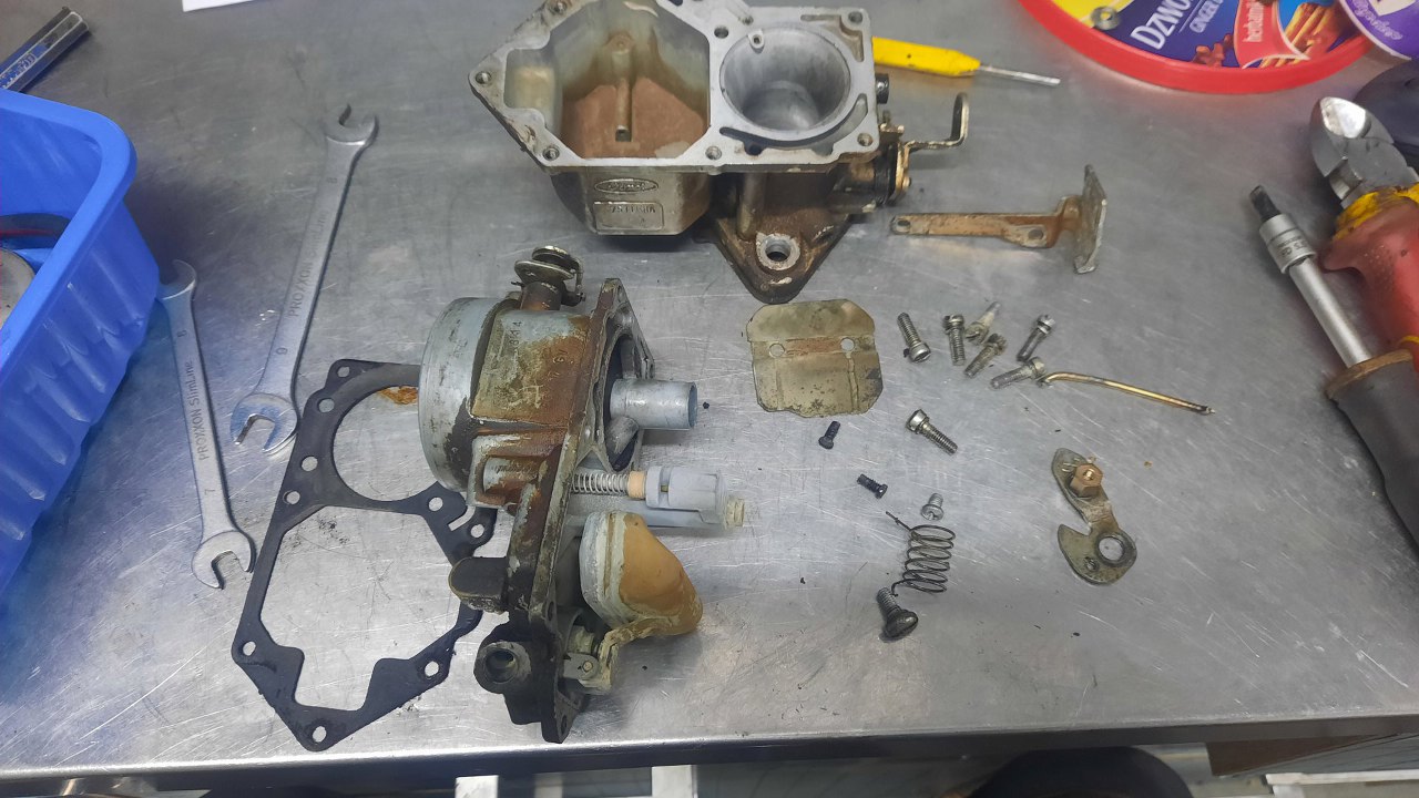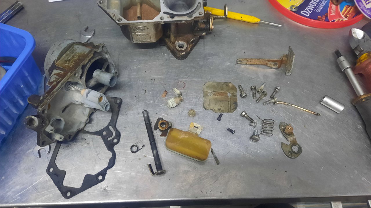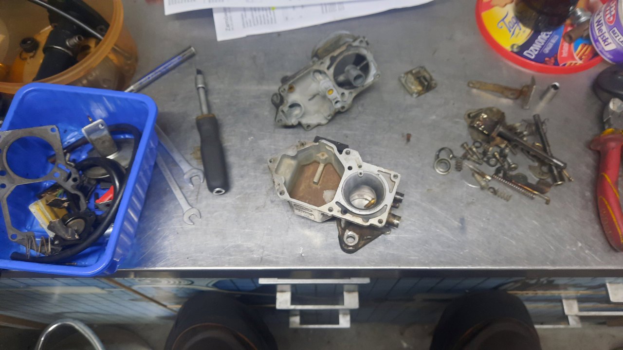 Gaźnik mam rozłożony. Części posegregowane - po lewej to, co do wywalenia, lub zostaje, ale tylko do mycia, pośrodku korpus do mycia, po prawej śrubki do cynkowania.