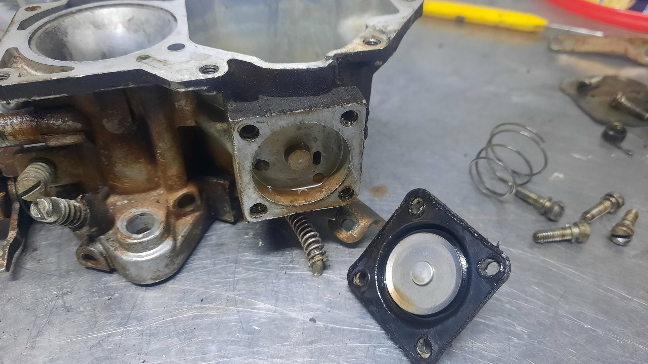 Odkręciłem pokrywkę pompki przyśpieszacza. Tu też w środku był osad ze starego paliwa. Sama membranka jeszcze się trzymała, ale jest stara, więc ją wymienię.