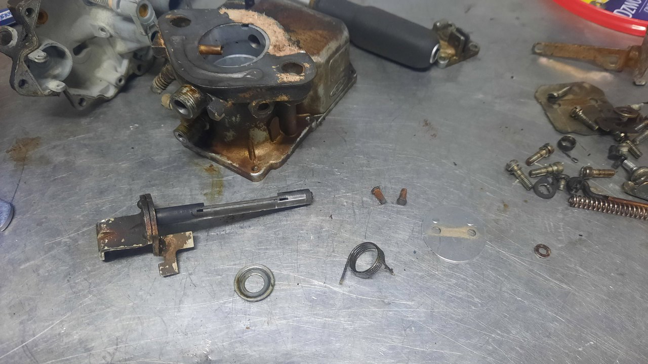 Po zdjęciu pokrywy gaźnika wykręciłem z niej klapkę ssania i jej ośkę.