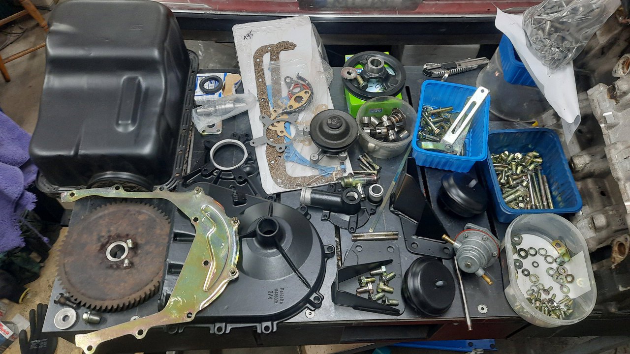 A potem wszystko to, co potrzebne do złożenia dołu silnika wyłożyłem na stół. Trochę tego jest...