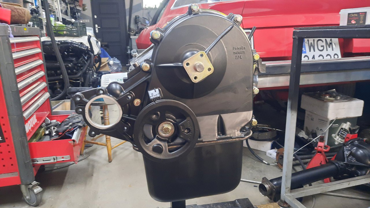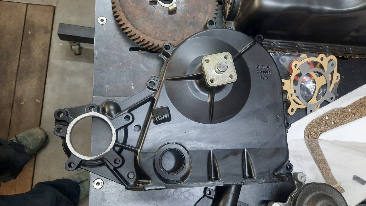 Najpierw zająłem się pokrywą rozrządu. Wymieniłem uszczelniacz, wcisnąłem na prasie nowe łożysko wiatraka, a na nie flanszę, do której przykręca się wiatrak i koło pasowe.