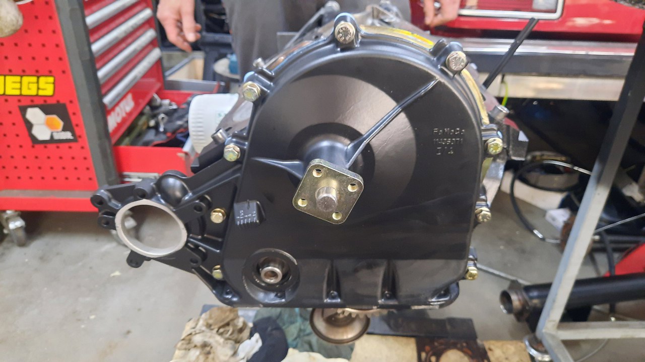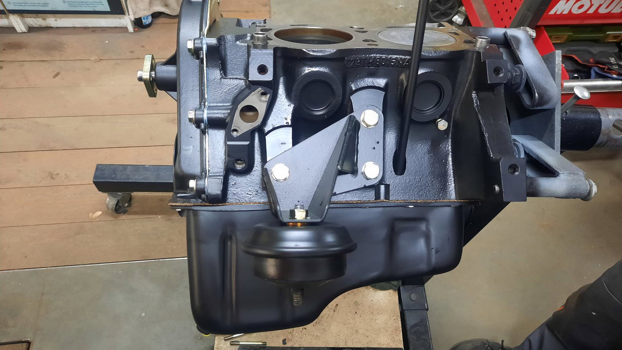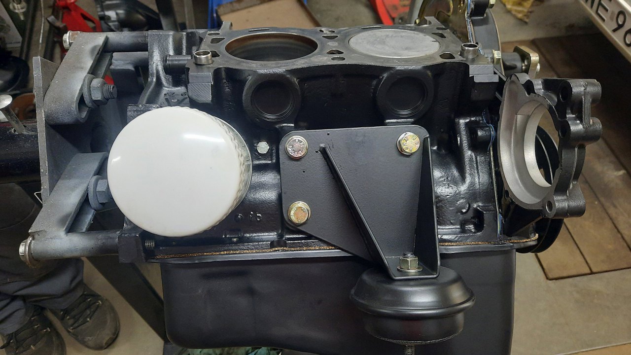 Z prawej strony silnika przykręciłem łapę z poduszką (poduszka już ma calowe gwinty) i korek układu chłodzenia z boku bloku.