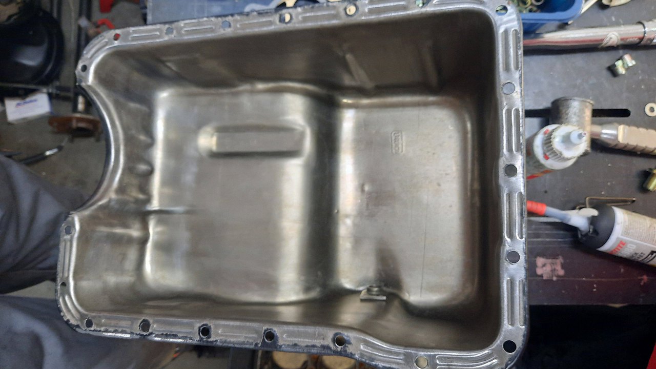 Potem zdjąłem zabezpieczenie miski oleju, które założyłem do piaskowania i malowania proszkowego. Doczyściłem miskę ze wszystkiego, co się przedostało do środka podczas piaskowania. Musi być idealnie czysta.