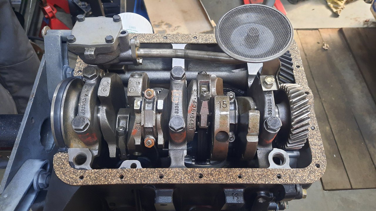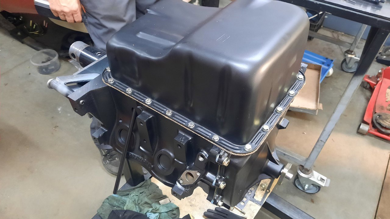 Przykręciłem miskę oleju, zwracając uwagę na długość śrub przy tylnej zaślepce wałka wyrównoważającego. Dałem też nowe podkładki, żeby tamtych poucinanych nie używać, bo wstyd by był trochę.
