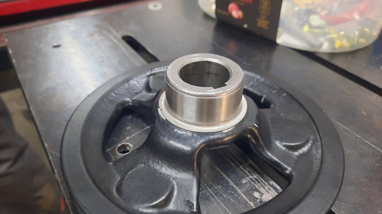 Na koło pasowe wcisnąłem tulejkę naprawczą, bo miejsce, gdzie pracuje simmering, było oczywiście wyrobione.