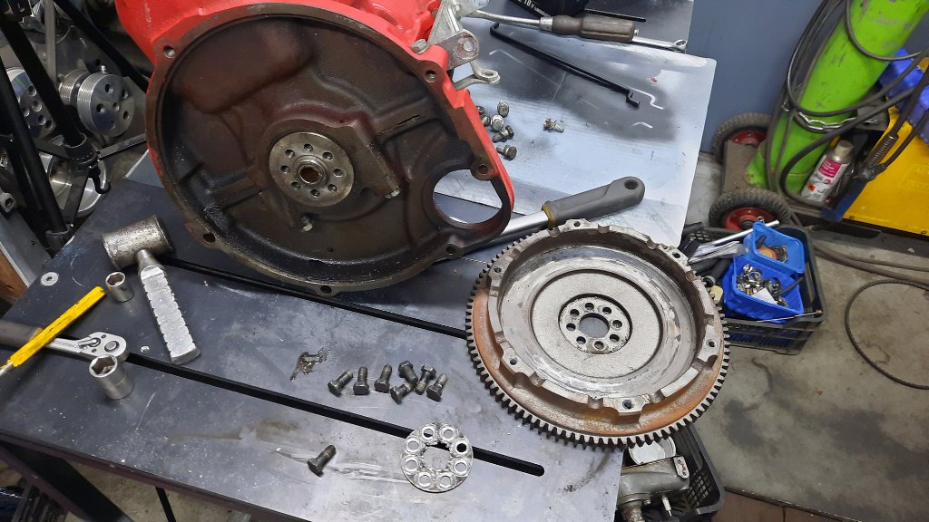 Rozgiąłem zaklepaną blaszkę zabezpieczającą śruby i zdjąłem koło zamachowe.