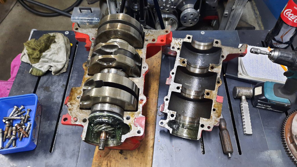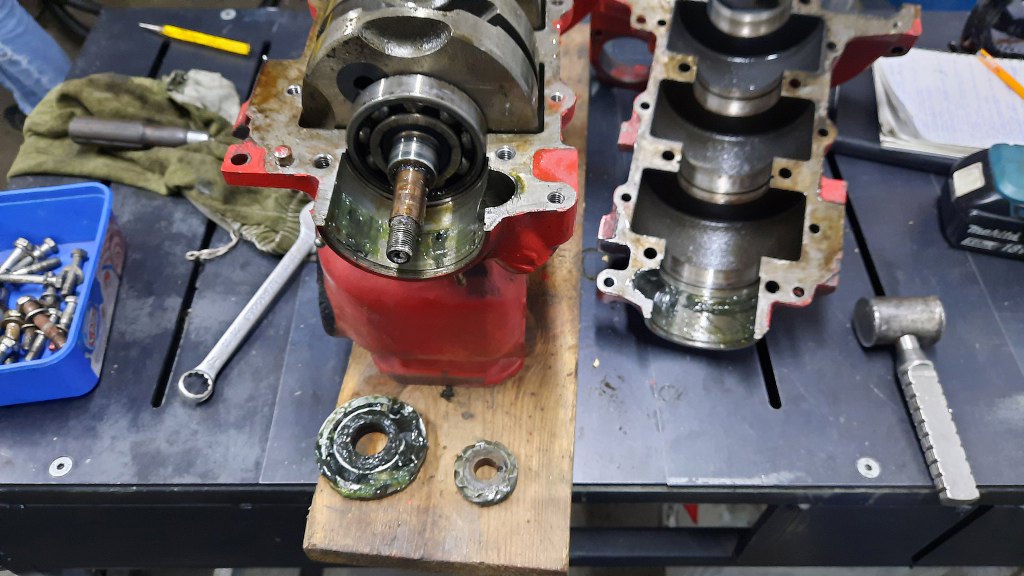 I otworzyłem skrzynię korbową. To ważny element w silniku dwusuwowym - wstępne sprężanie mieszanki odbywa się właśnie tu. Mieszanka jednocześnie smaruje łożyska - dlatego wlewa się olej do paliwa. Każdy cylinder ma oddzielną komorę wstępnego sprężania - łożyska oddzielają poszczególne komory od siebie.