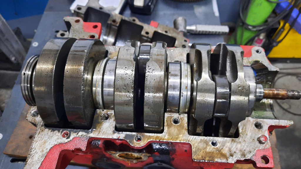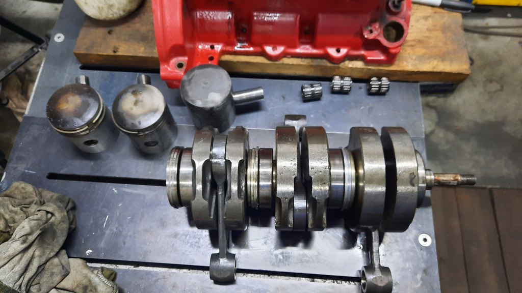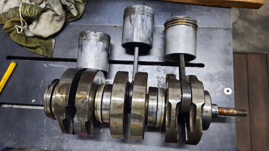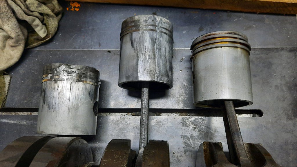 Wyjąłem wszystkie tłoki. Korbowody na obu końcach też mają klasyczne łożyska, a nie panewki - panewek nie da się smarować mieszanką. Łożyska są w dobrym stanie. Wału nie będę nawet rozkładał dalej.
