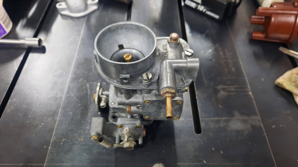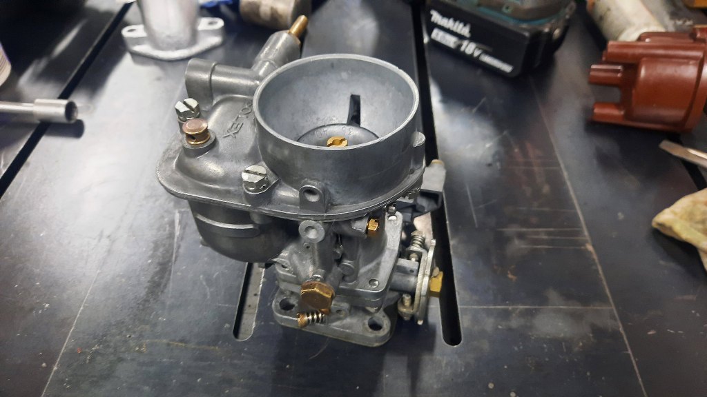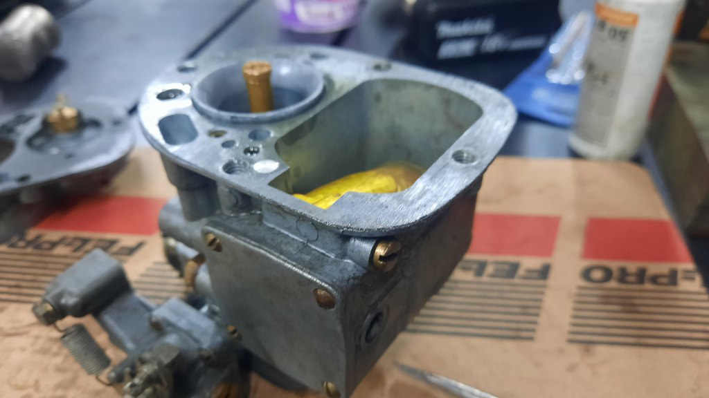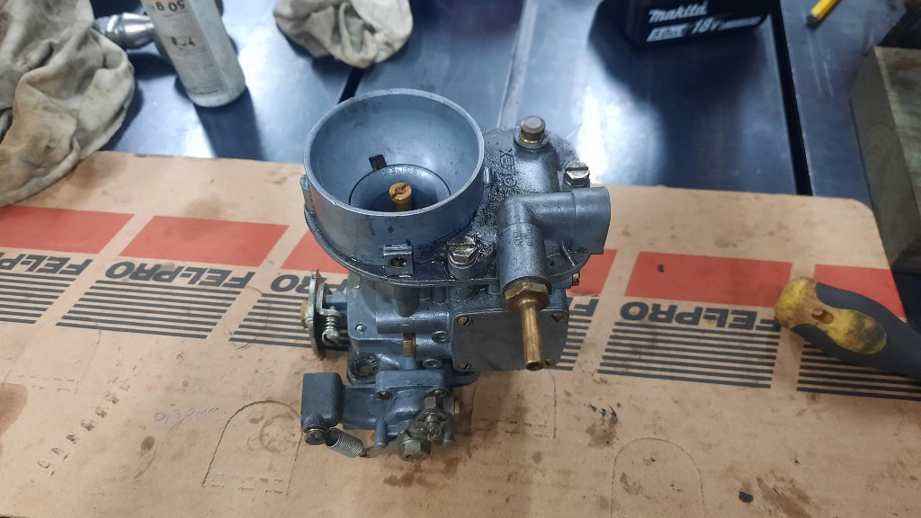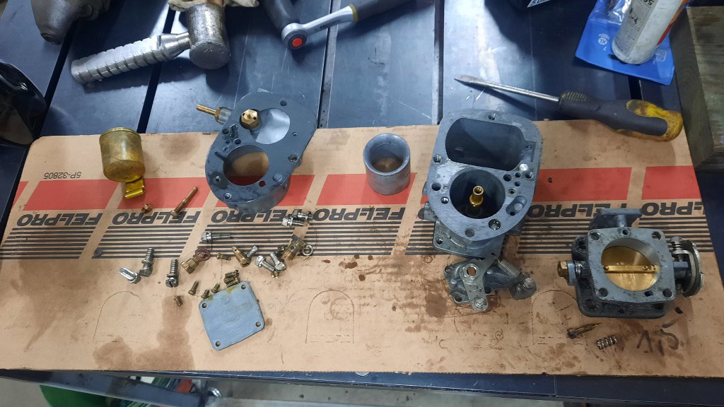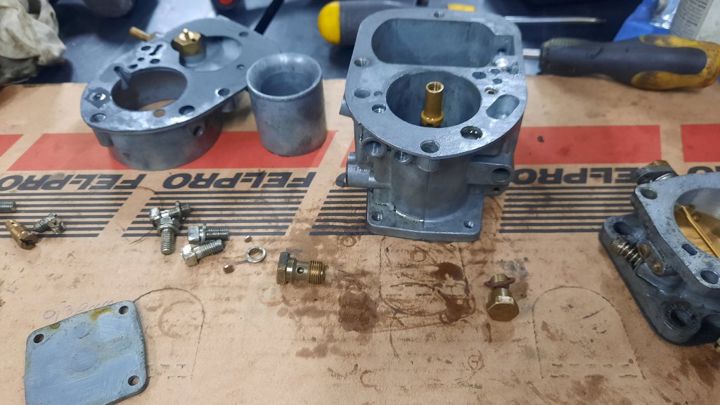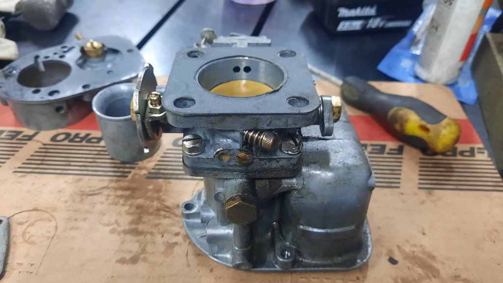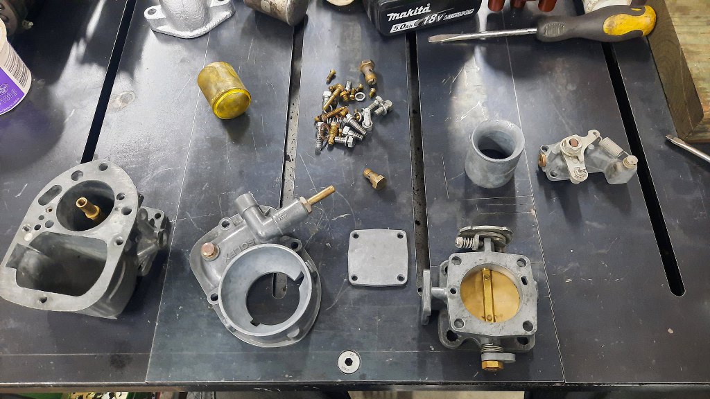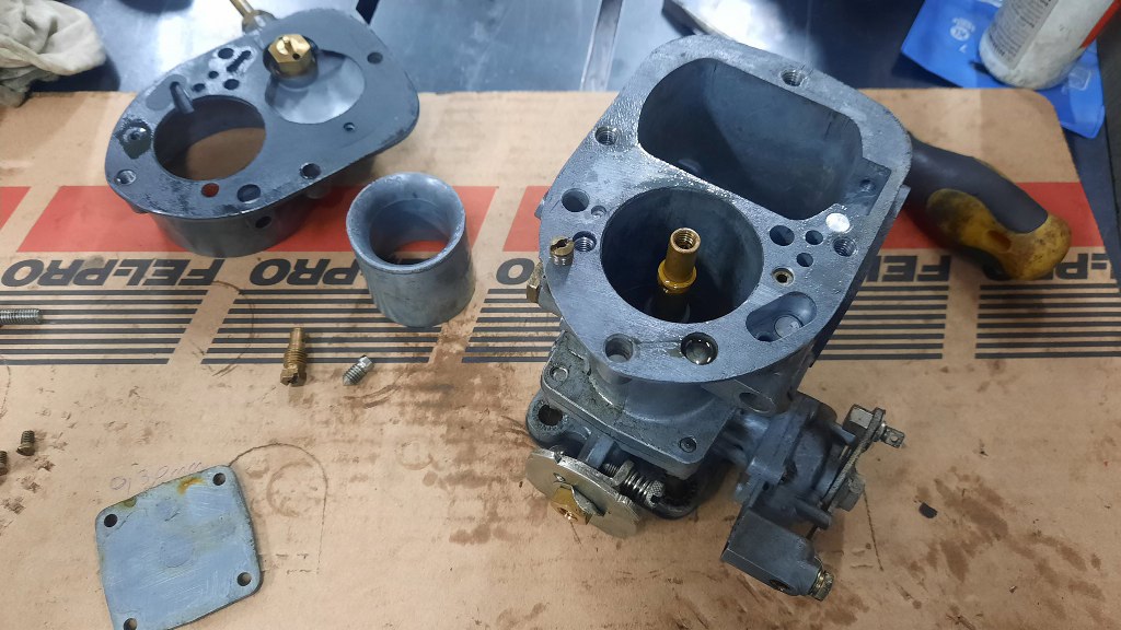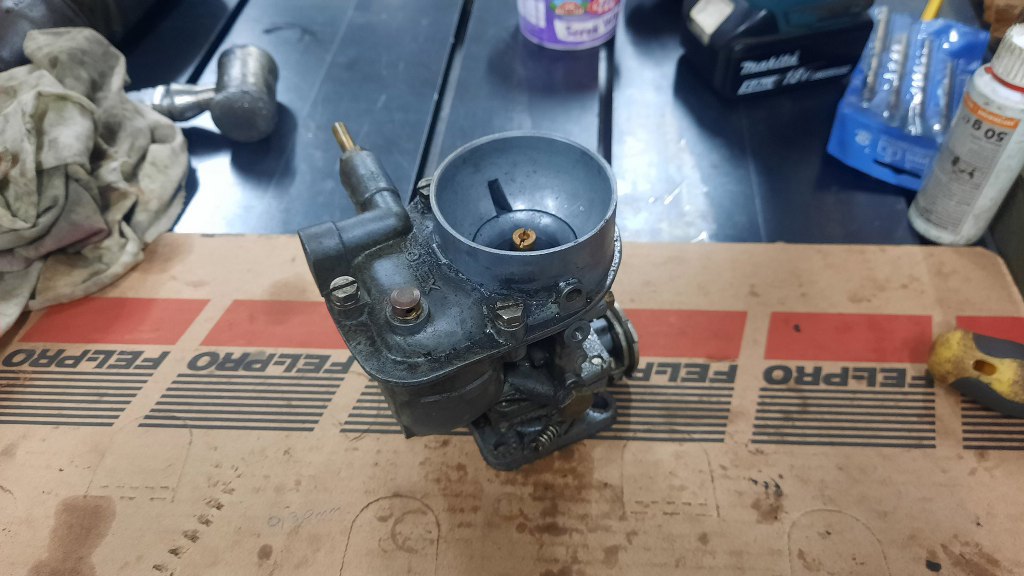 Po odkręceniu jeszcze kilku drobiazgów mam gaźnik rozłożony. Ponieważ jest to raczej "szybki przegląd" niż odrestaurowanie, to na razie nie będę rozkładał tego bardziej - dopóki nie cynkuję wszystkich śrubek, to nie ma to sensu.