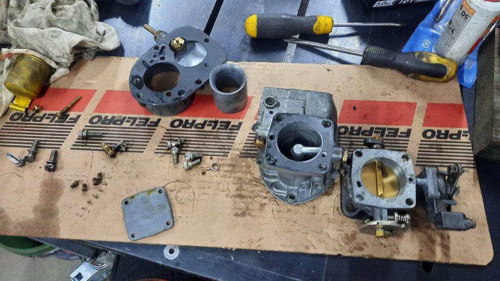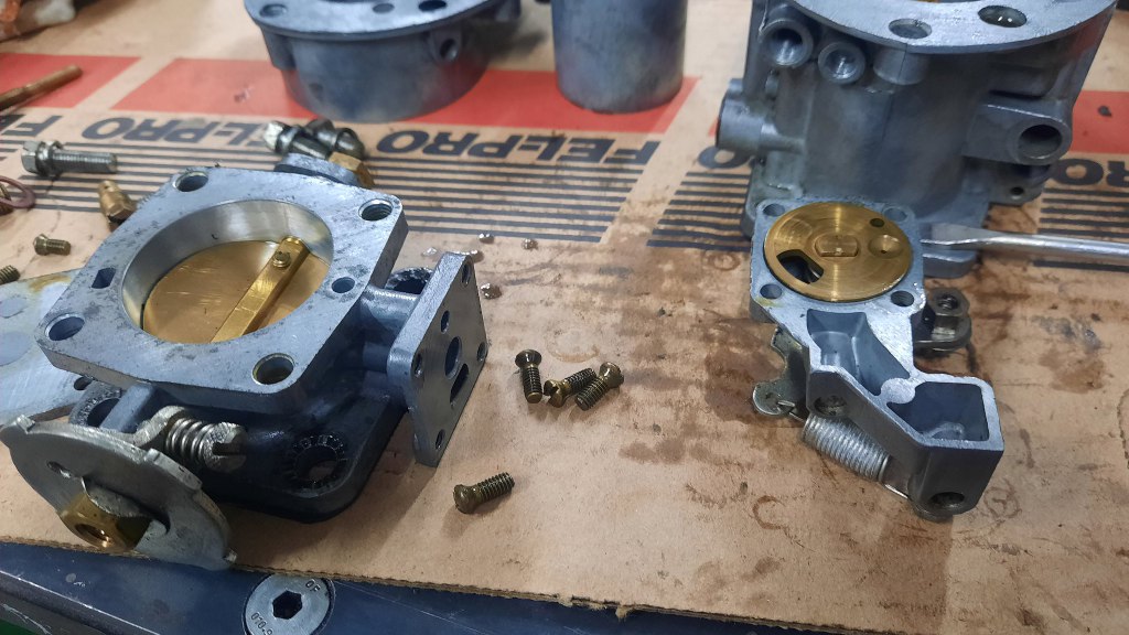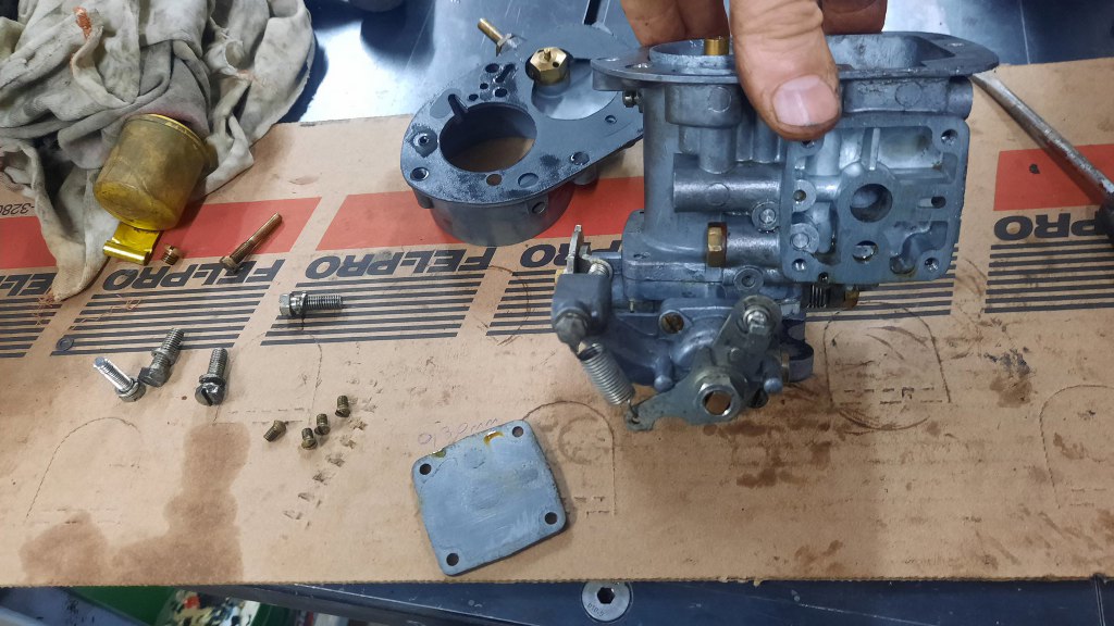 Po odwróceniu go do góry nogami mam dostęp do śrub mocujących część z przepustnicą do korpusu gaźnika.