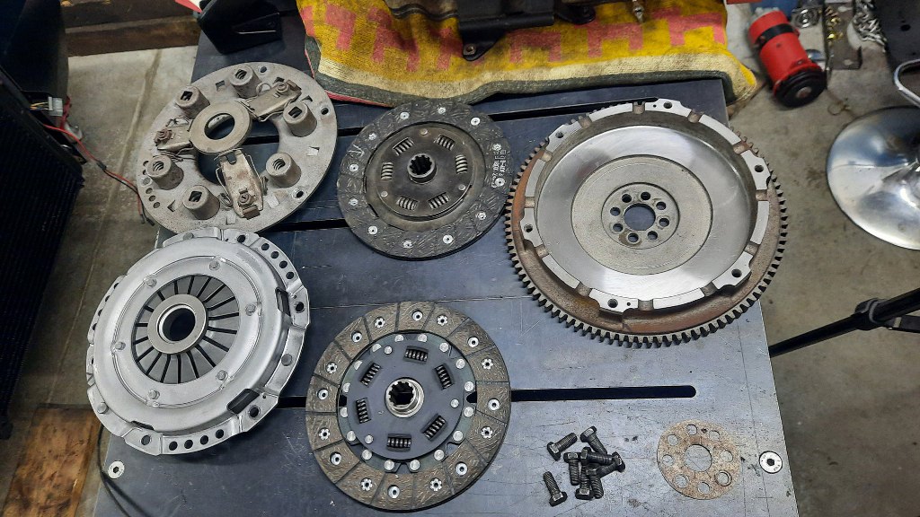 Czyli sprzęgło. Coś mi krzywo pasowało. Po dokładnym zmierzeniu wyszło na to, że docisk ma z jednej strony grubość 10mm, a z drugiej 8mm. Jak to mówią amerykanie - something is not yes :). Zawiozłem całość do szlifierni, gdzie planowali mi docisk i powiedziałem to samo. Szlifiernia stanęła na wysokości zadania i poczuła się do odpowiedzialności. Sprzęgło wcześniej na pewno nie było aż tak krzywe, bo normalnie jeździło. Jeśli nawet by było, to nie powinni wtedy w ogóle szlifować. Ostatecznie zaproponowali ogarnięcie nowego sprzęgła. To trochę trwało niestety, ale w końcu mam nowy komplet sprzęgła do zamontowania. I to już nowszej konstrukcji (te na dole), typu słoneczko.