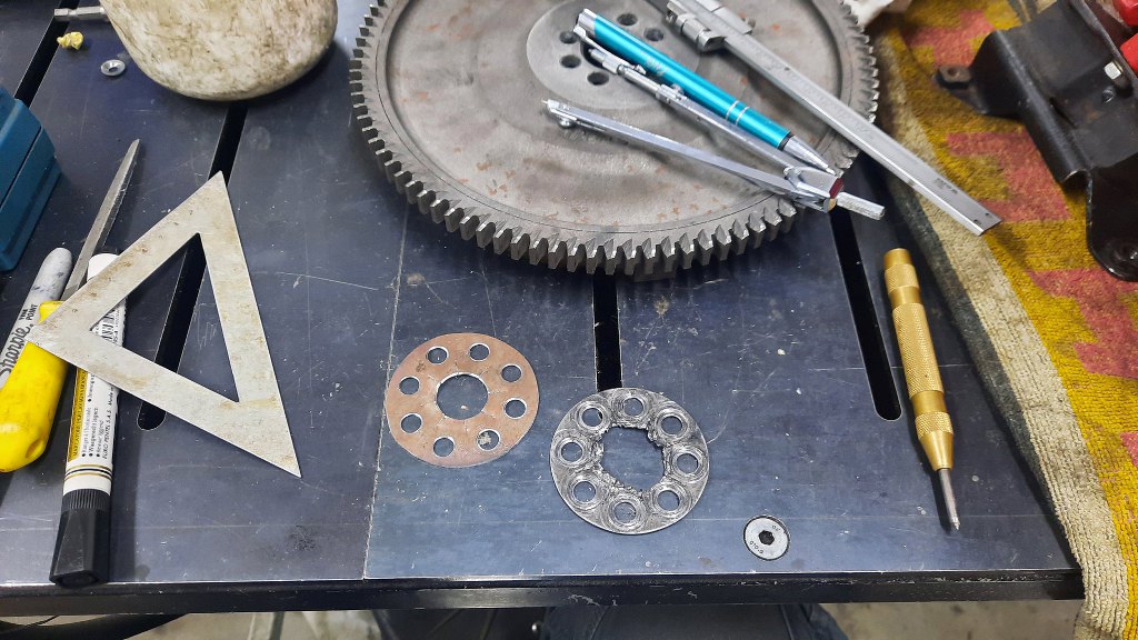 Przy okazji wyzionęła ducha podkładka pod śruby koła zamachowego, którą się zagina, żeby je zabezpieczyć przed odkręcaniem. Nawet widziałem gdzieś taką nową, ale potrzebowałemszybko to skręcić i mieć z głowy, więc na szybko zrobiłem nową sam.