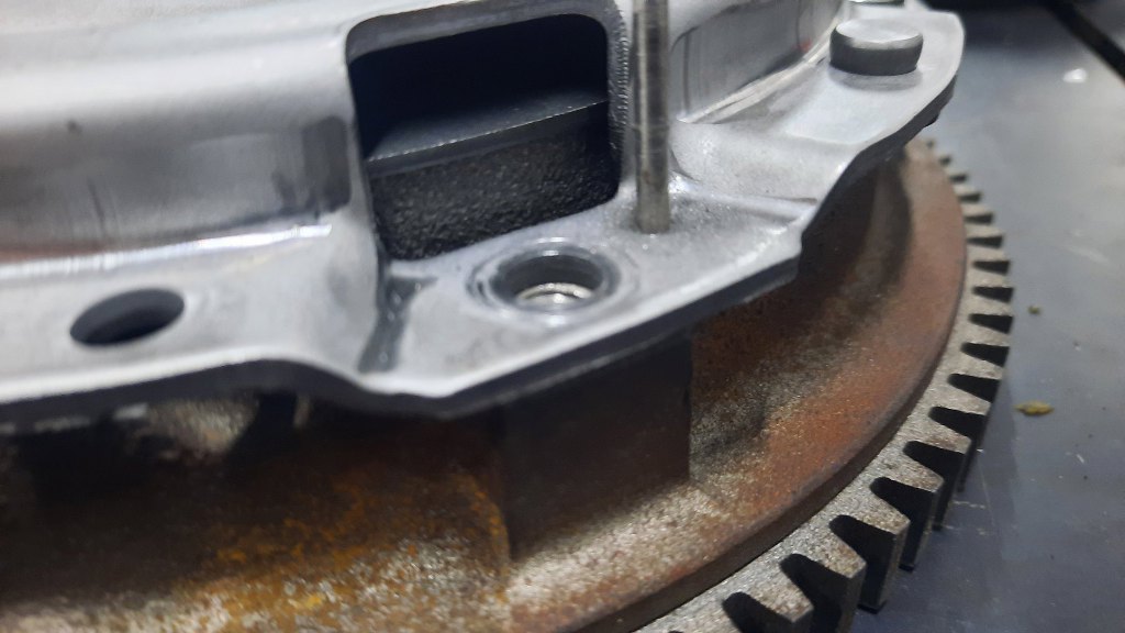 Ale jak w takim razie to rozkręcić, założyć na silnik, założyć tarczę sprzęgła i skręcić z powrotem we właściwy sposób? No tak, jak to jest robione zazwyczaj fabrycznie - zakołkować. Ale zrobię to w uproszczony sposób. Najpierw nawierciłem dwa otwory po przeciwległych stronach docisku, przechodzące aż do koła zamachowego.