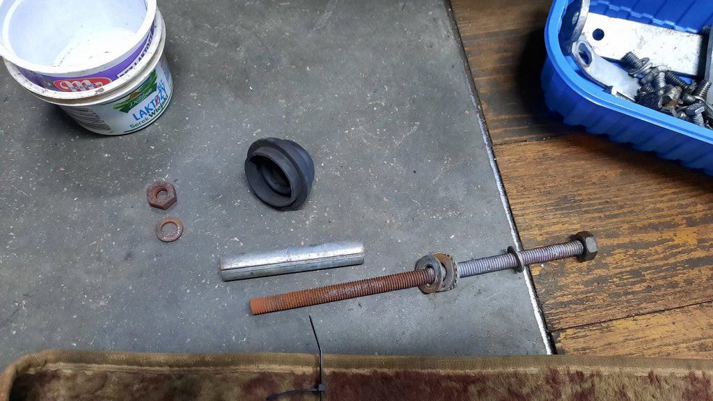 Tłumik, przykręcony po lewej stronie silnika do wydechu, przechodzi pod podłogą w poprzek na prawą stronę silnika, gdzie podwieszony jest do silnika taką konstrukcją. Dzięki temu rusza się razem z silnikiem. Tyle, że konstrukcja ta, zamiast właściwej śruby calowej, ma użyty zwykły pręt gwintowany. Zamienię go z powrotem na właściwą śrubę.