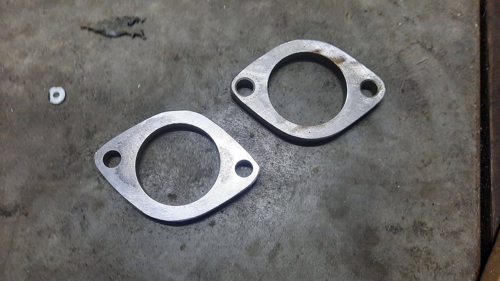 No i właśnie te przykręcenie jest trudne, bo, po ustawieniu tulejki mocującej tłumik pod prądnicą, trzeba naciągnąć rurę do wydechu, żeby to się razem zeszło i było szczelne. Ale flansza od strony tłumika była żeliwna, stara i wielokrotnie nagrzana. Domyślasz się, dokąd to zmierza? Oczywicie pękła. Żeby ją wymienić, trzeba by odciąć rurę od tłumika, a tego nie chciałem robić. Wyciąłem ze stali takie nowe flansze (dwie na wszelki wypadek). Rozciąłem jedną z nich i pospawałem na rurze. Żeliwo po spawaniu pękło, stal wytrzyma. Po wymianie tej flanszy udało mi się to wreszcie właściwie poskładać.