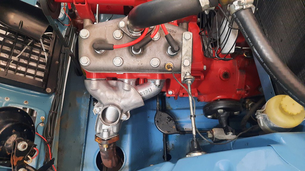 Tu widać lewą stronę silnika i miejsce, gdzie koniec rury od tłumika przykręca się do kolektora wydechowego.