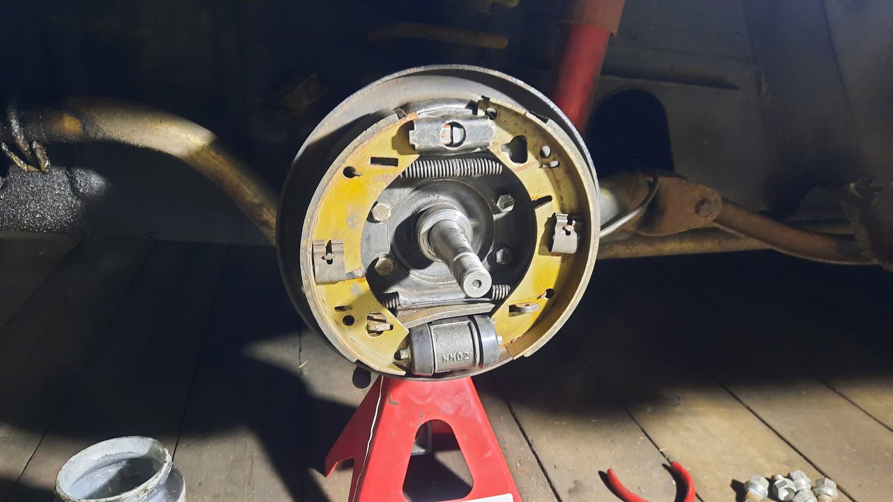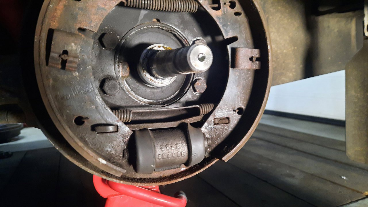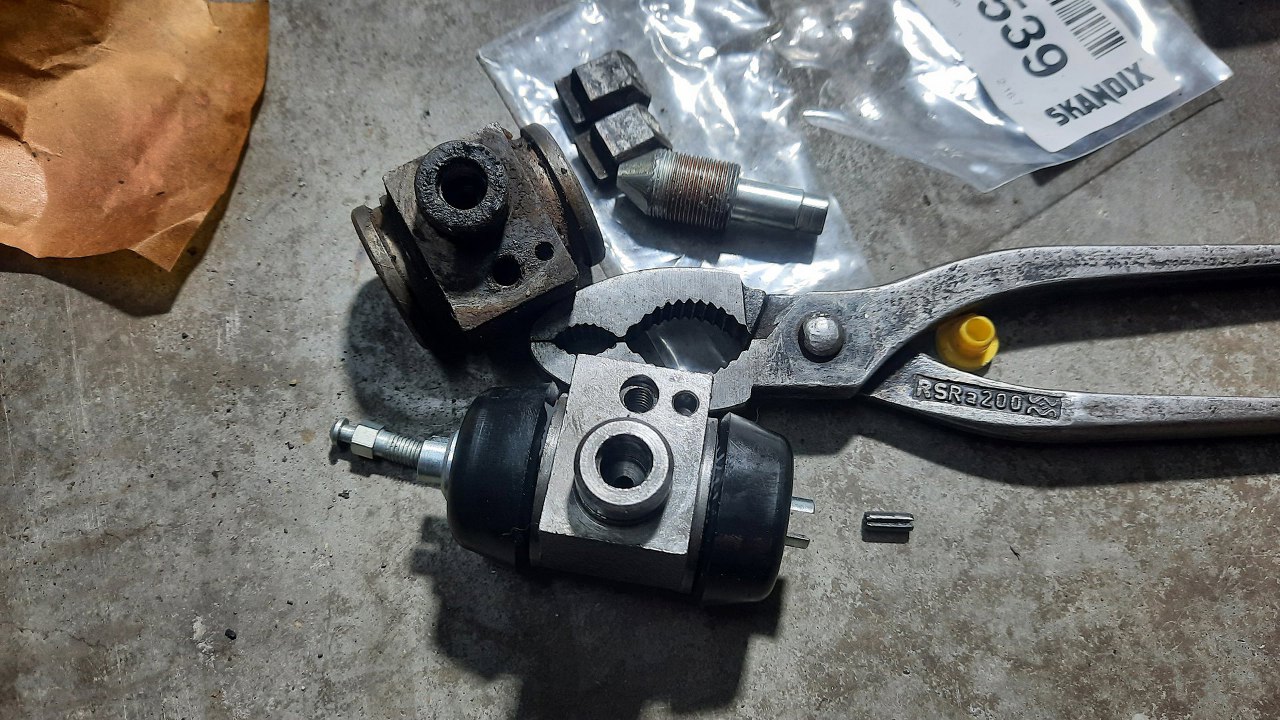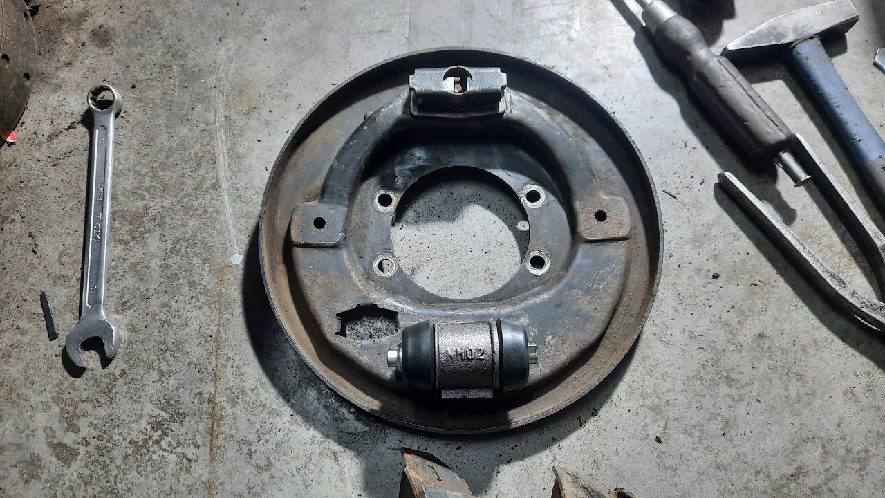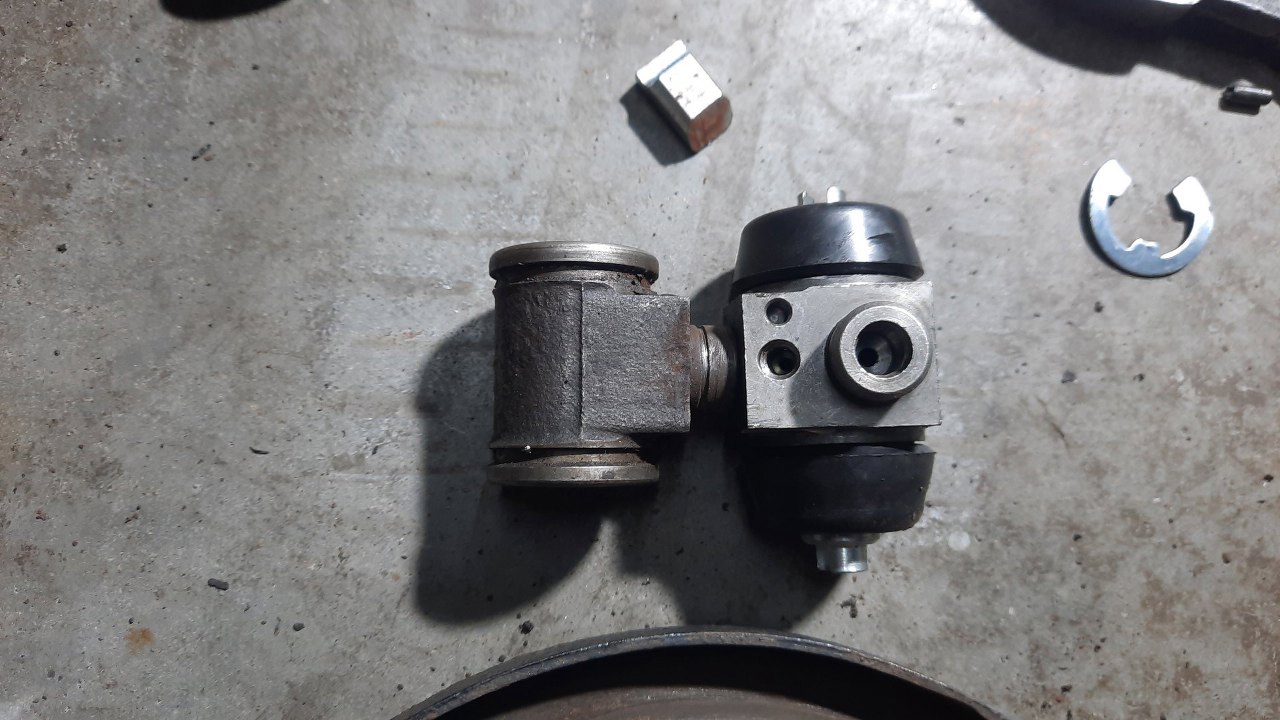 Cylinderki hamulcowe były przeciętne, ale gumki nadawały się do wymiany. Dam nowe cylinderki, bo tak jest prościej niż regenerować stare. Ale tu też jest inaczej niż zawsze - w tych tarczach kotwicznych nie ma otworu na ten pin ustalający (już jest wyjęty na zdjęciu), cylinderek jest ustalany w tarczy kotwicznej dwoma w niej przetłoczeniami.