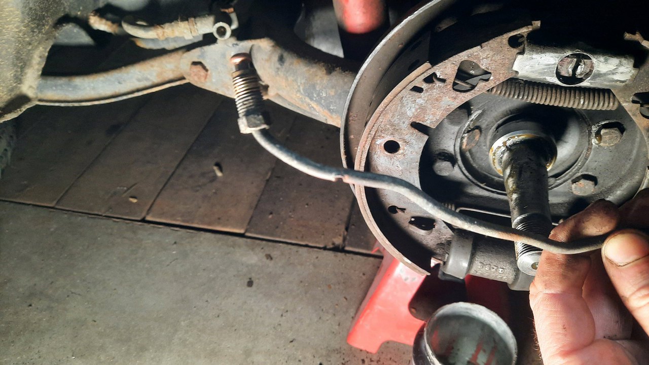 Ale to nie koniec niespodzianek: rurka hamulcowa idąca z trójnika do cylinderka ma tu mały promień zagięcia. Na tyle mały, że ktoś dorabiając linkę nie był w stanie tego odpowiednio dogiąć. Skończyło się to tym, że rant felgi przetarł rurkę hamulcową prawie na wylot. Najlepsze jest to, że to tak działało naście lat!. W sumie może powinienem to zostawić? Skoro działało... :).
