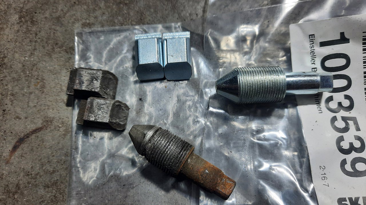 Zajmę się teraz złożeniem hamulców. Zauważyłem, że bardzo mocno są wyrobione te kliny regulujące szczęki hamulcowe, dlatego dam tu nowe. Niestety śruba regulacyjna z zestawu ma inny gwint, więc muszę dać starą. Ciekawe, czy to jest kwestia rocznika?