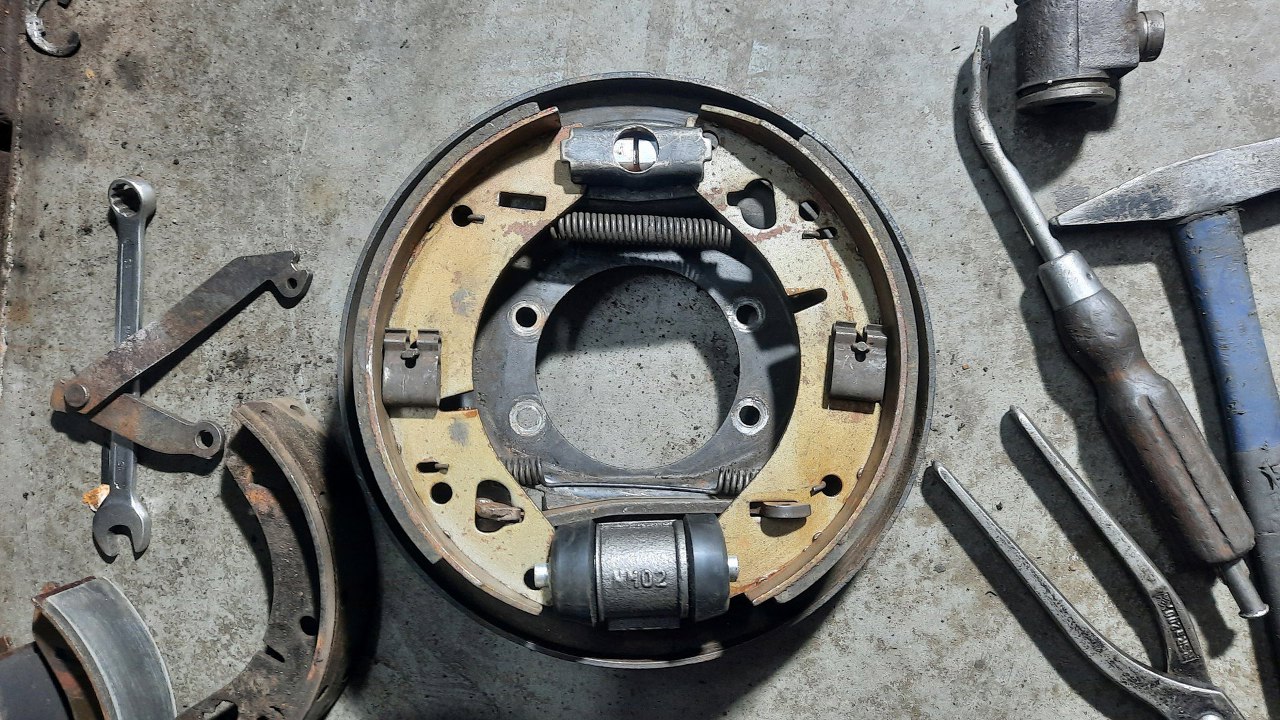 Jak już ogarnąłem te szczegóły, to zacząłem składać wszystko na tarczę kotwiczną. Zdjąłem ją z zawieszenia, bo to tylko cztery śruby, a dużo wygodniej się pracuje. Zwłaszcza ten pierścień sprężysty mocujący cylinderek jest ciężki do założenia pod samochodem.