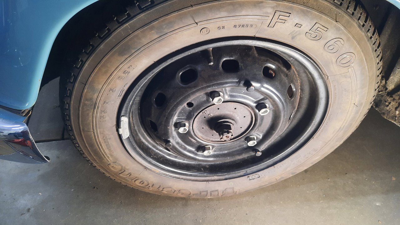 Hamulce przednie zacząłem nawet przed tylnymi, ale miałem z nimi trochę więcej przygód... Ale po kolei. Przed zdjęciem kół zwróciłem uwagę, że te felgi są ciut inne od późniejszych - mają dodatkowy otwór między śrubami kół, tu widoczny u góry lekko po lewej. Ten otwór służy do regulacji szczęk hamulcowych bez zdejmowania kół. Sprytne!