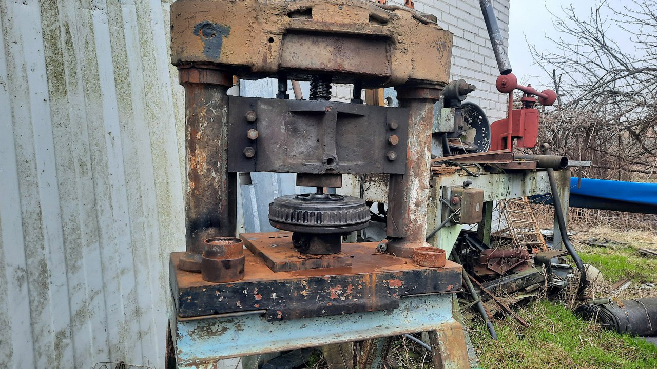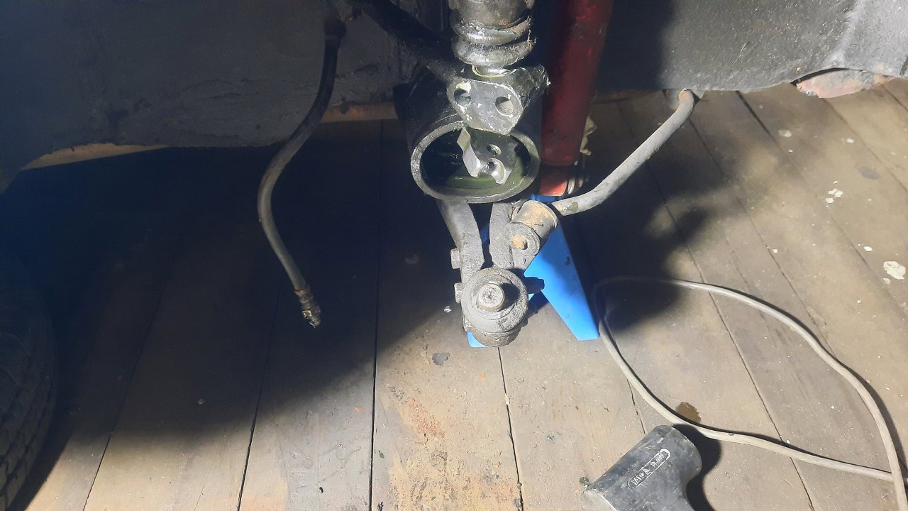 Po zdjęciu kół i poluzowaniu nakrętki trzymającej bęben próbowałem go ruszyć uderzając to młotkiem. Zazwyczaj dwa-trzy lekkie uderzenia młotkiem 2kg powodują odklejenie się bębna ze stożka półośki. Tu nic nie dały. Po dłuższym zastanowieniu w końcu zdjąłem całą zwrotnicę. O tyle niechętnie, że wymaga to rozpięcia przegubu i paprania się w jego smarze... Po zdjęciu zwrotnicy włożyłem całość w prasę i grzałem palnikiem do ponad 100 stopni. Bezskutecznie. Zrezygnowany podjechałem do znajomego z bardzo fajną starą prasą balansową, zdecydowanie większą od mojej.