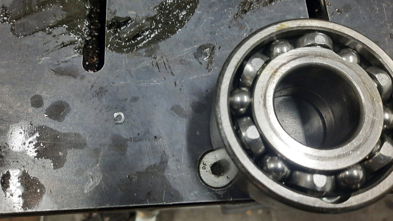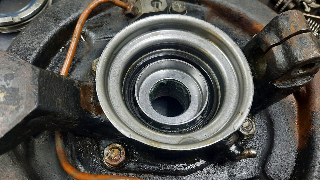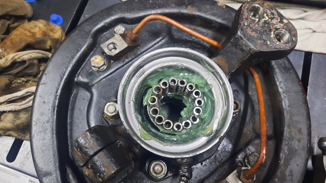 Potem wyjąłem łożyska. Podczas ich mycia w jednym z nich znalazłem trochę opiłków, największy z nich widać po lewej od łożyska. Niepokojąco przypomina kawałek jednej ze sprężynek spod półosi... Potem się okazało, że tych sprężynek z jednej strony brakowało 10!