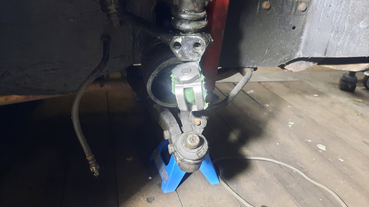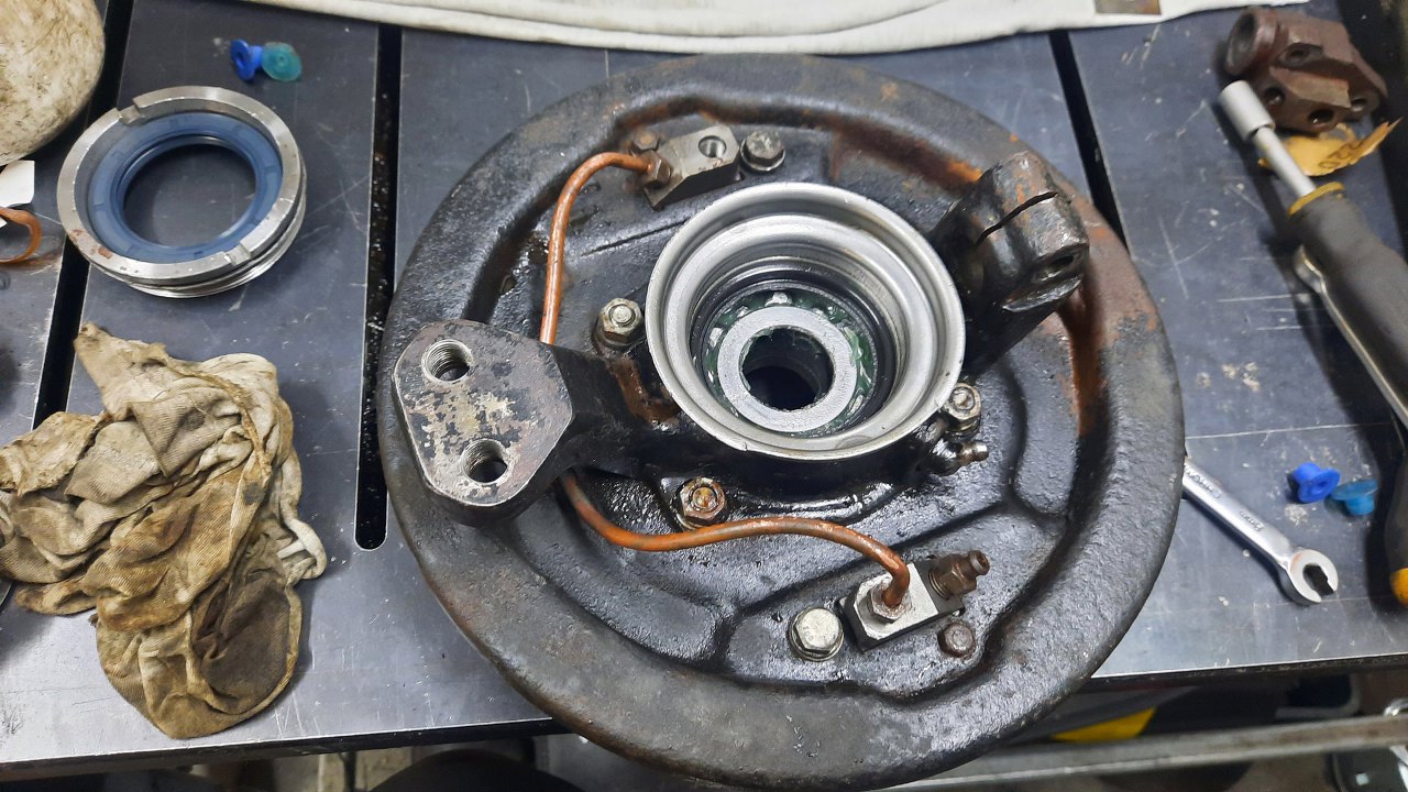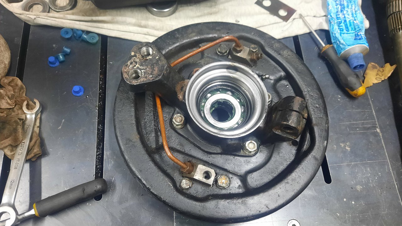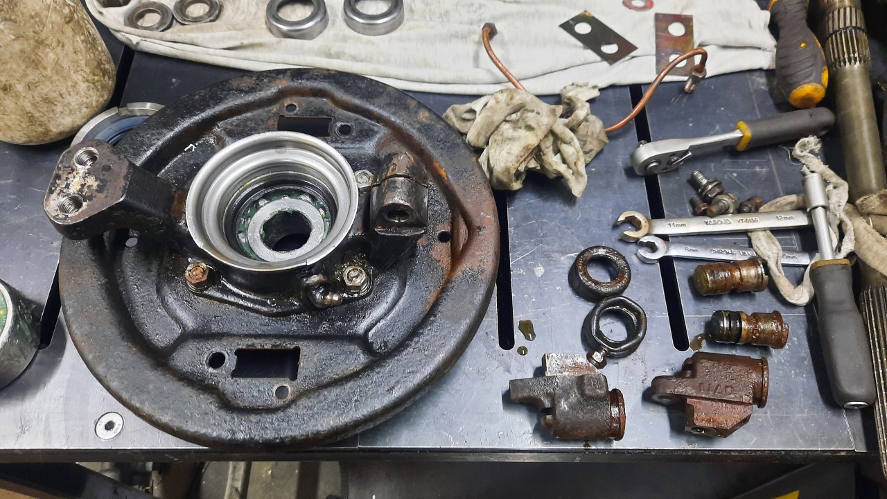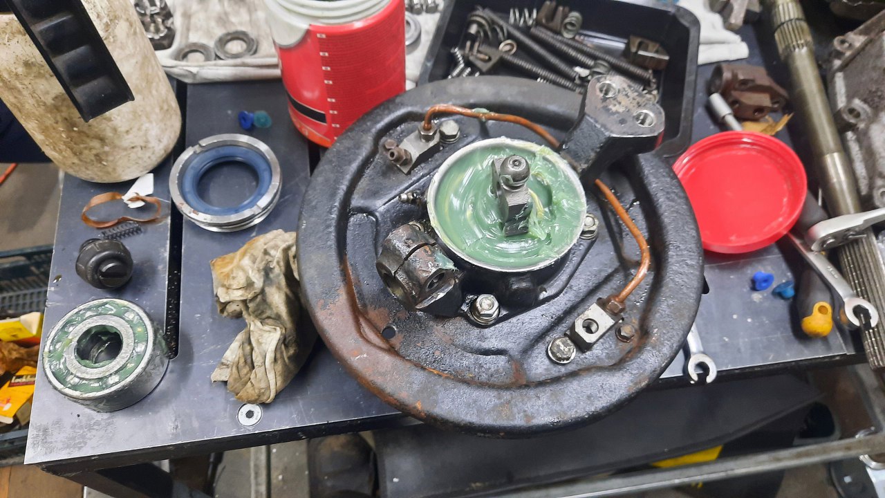 Domyte też zostały zwrotnice i tarcze kotwiczne, były strasznie usmarowane. Nic dziwnego, w tym zawieszeniu jest jeszcze sporo kalamitek, a smar wycieka gdzie tylko się da. Po całej operacji z hamulcami nasmarowałem wszystkie punkty smarowania zawieszenia, jakie tylko znalazłem. Nie wiadomo kiedy ktoś to ostatnio robił. Łożyska też już nasmarowane.