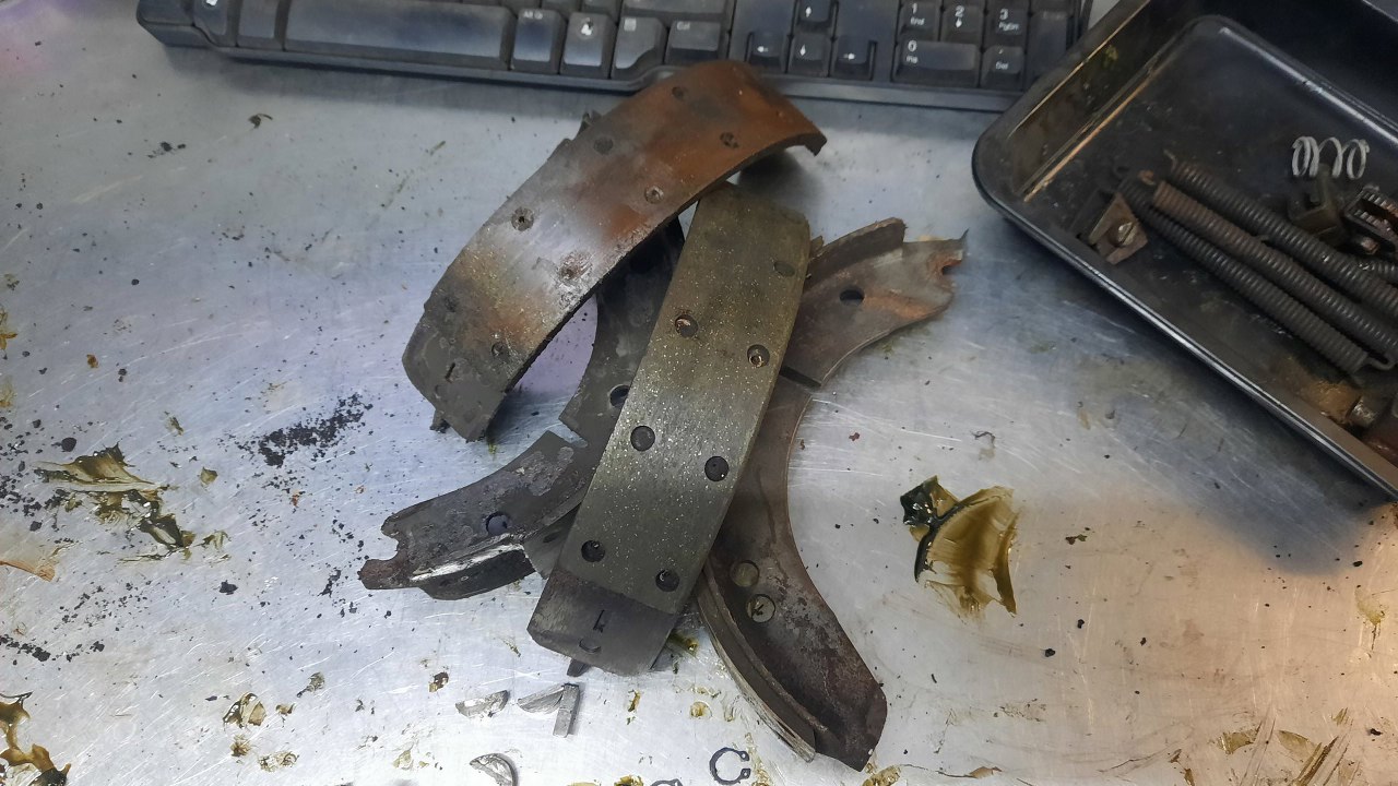 Szczęki od tego gorszego bębna w bardzo słabym stanie. Nawet nie zużyte, ale mocno zawalone smarem. To naprawdę od dawna nie mogło hamować :).