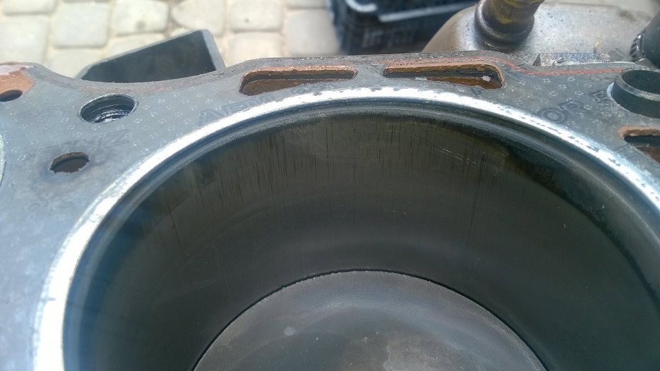 Niestety na jednym z cylindrów znaleźliśmy takie rysy. Wyglądają jednak na rysy sprzed poprzedniego remontu, bo obecnie nic niepokojącego w tym cylindrze, czy na tłoku, nie znaleźliśmy. Szymon postanowił zostawić to tak, jak jest.