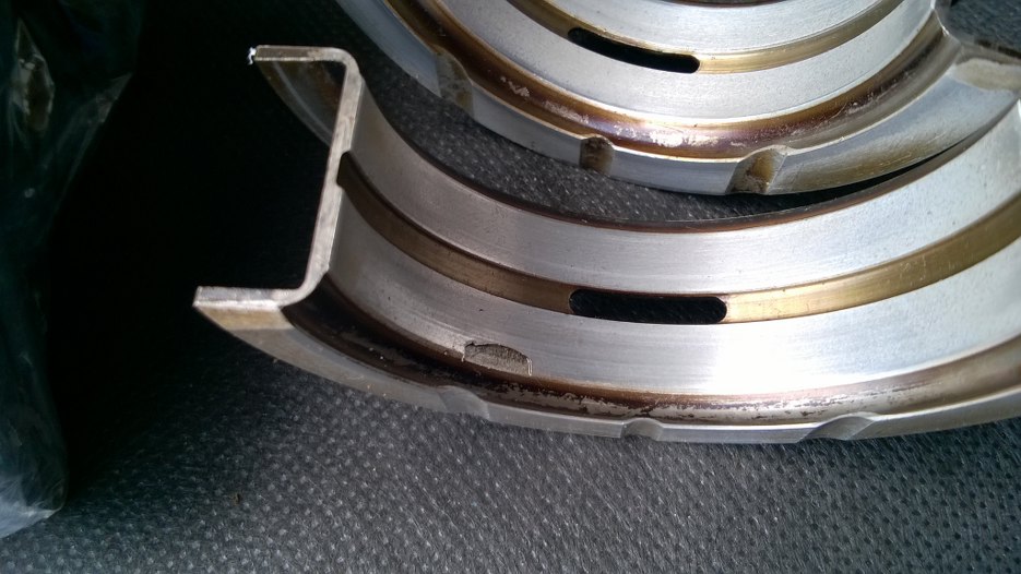 Jedna z panewek głównych była uszczerbiona, co widać na zdjęciu. Takie uszkodzenie powstaje zazwyczaj na skutek nieuważnego wkładania wału korbowego na miejsce - panewka po prostu została uderzona. Z tego powodu wymieniliśmy panewki główne. Gdyby nie to, zostałyby, bo były idealne... w końcu świeżo włożone :)