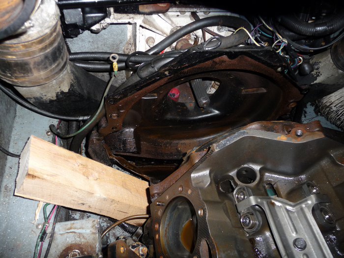 Tu widać coś w rodzaju dzwona skrzyni biegów , której oczywiście nie ma. Widać wałek odbioru mocy.