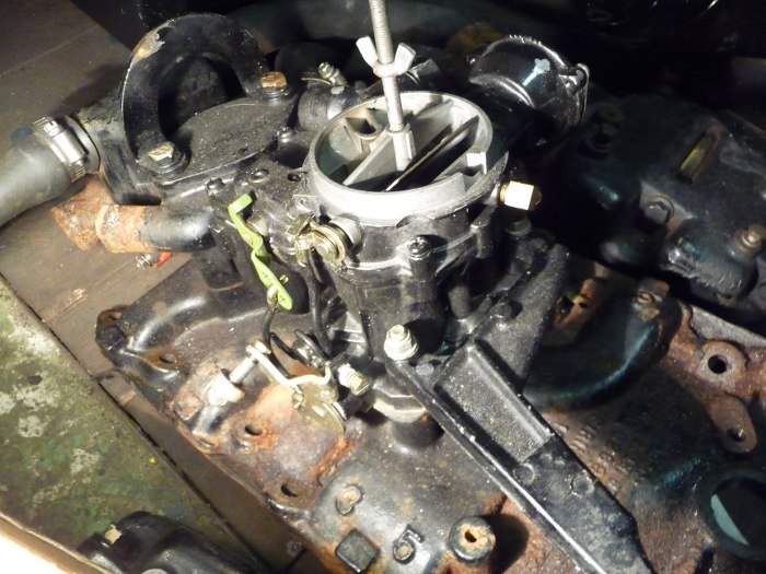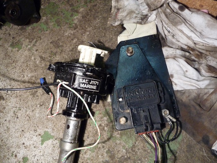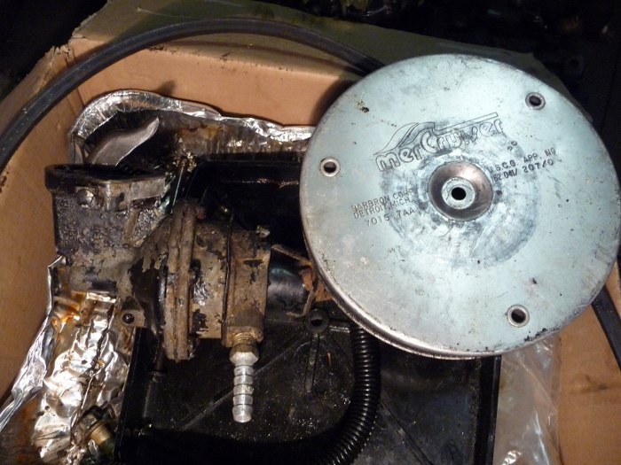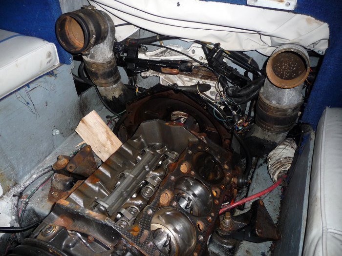 Silnik jest oczywiście w wersji łodziowej, czyli ma inny od samochodowego filtr powietrza, być może gaźnik, specjalne kolektory wydechowe i niski aparat zapłonowy. Również moduł zapłonowy jest sygnowany logiem Mercruisera.