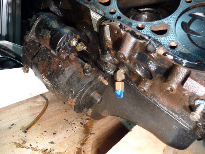 Widok na rozrusznik. Co to jest obok niego? Kranik? I znowu olśnienie - przecież ten silnik nie ma zamkniętego obiegu cieczy, tylko jest chłodzony wodą z zewnątrz łódki - a woda jak wiadomo powoduje rdzewienie lub może zamarznąć, więc trzeba ją spuszczać...