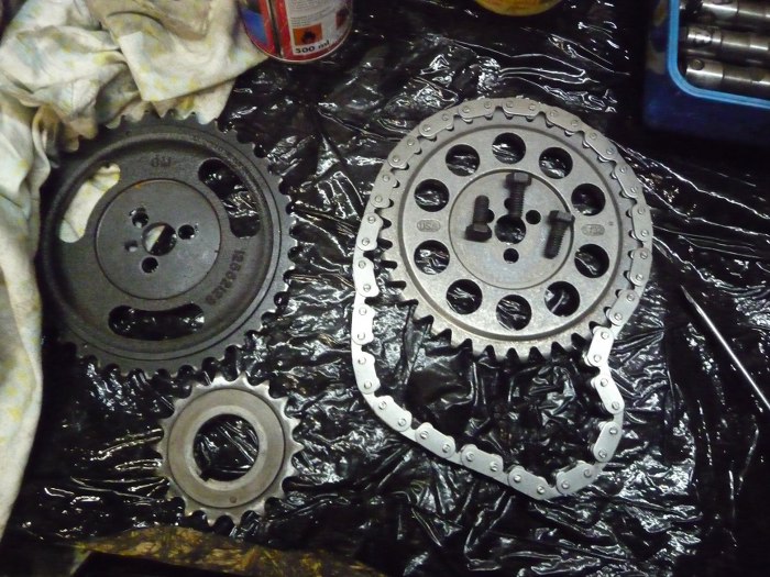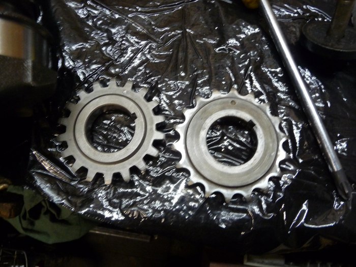 Po lewej stare koła rozrządu (łańcuch poległ podczas zdejmowania - musiałem go rozkuć). Po prawej nowy rozrząd i przygotowane śrubki.