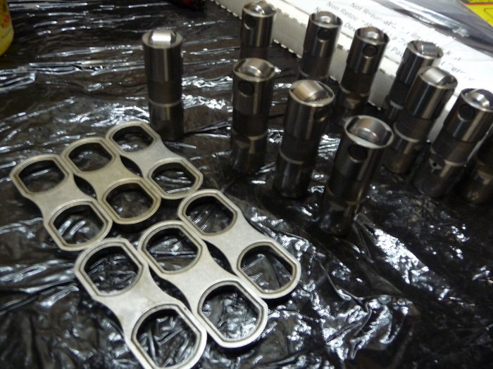 Popychacze na miejscach. Płytki ustalające są potrzebne, żeby rolki popychaczy toczyły się prostopadle po wałku rozrządu, a nie obracały się.