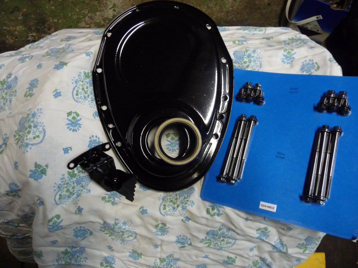 Następna w kolejce będzie pokrywa rozrządu. Dziś już tego nie zrobię, bo się wieczór zbliża, ale chciałem pokazać jak wygląda po piaskowaniu i malowaniu. Obok leży wskaźnik GMP, na niej nowy simmering wału korbowego, który jeszcze muszę wymienić. Po prawej nowe śruby ARPa.