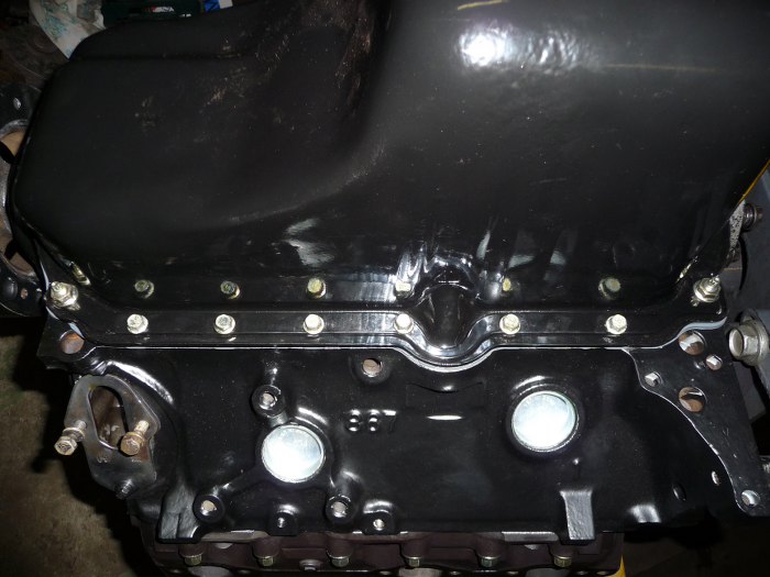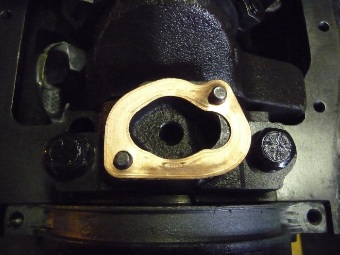 Pomiędzy pompą oleju a stopką wału korbowego jest taka fajna miedziana uszczelka. W ogóle SBC to ciekawy silnik pod względem mocowania pompy oleju - na stopce wału. Zazwyczaj są przykręcane bezpośrednio do bloku. Jakbym dał dłuższą śrubę, to przykręcając pompę oleju można przebić się przez panewkę główną wału i wkręcić się w wał :)
