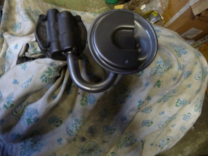 Potem żmudne mierzenie na jakiej wysokości ma być smok pompy oleju. Nie może być zbyt nisko, ani zbyt wysoko nad dnem miski. Nie tak łatwo trafić w odpowiednie miejsce. Jak już siedzi na miejscu, to dla bezpieczeństwa należy go podspawać do obudowy pompy. Ciekawe co by się stało jakby wypadł :)