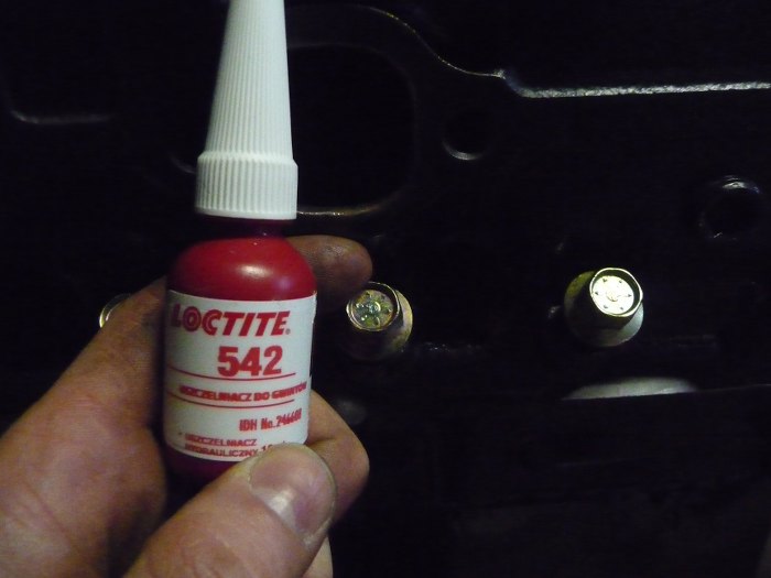 Ponieważ większość (a jeśli dobrze sprawdzałem, to nawet wszystkie) śrub przechodzi przez blok aż do płaszcza wodnego, to trzeba uszczelnić ich gwint, żeby nic nie przeciekało. Znowu loctite... przedstawicieli firmy proszę o opłaty za reklamę.
