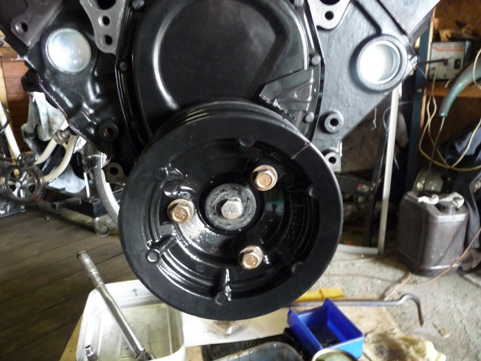 Znalazłem koło pasowe wału korbowego (wypiaskowane i pomalowane) i też przykręciłem. Przy okazji odkryłem, że balancer nie doszedł na swoje właściwe miejsce, więc pokombinowałem i już jest ok.