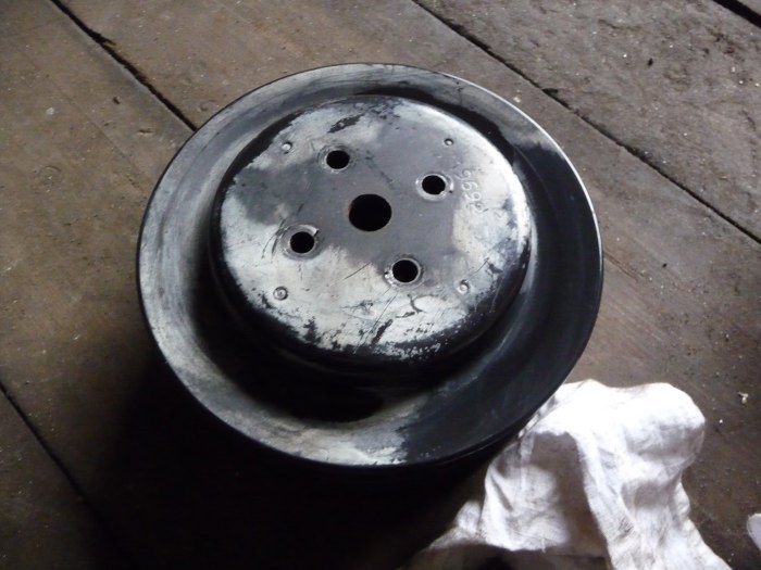 Koło pasowe pompy wody jakoś mi umknęło jak oddawałem rzeczy do piaskowania. Jak zacząłem je czyścić okazało się, że pod farbą jest podkład (marnie położony), a pod nim piękny lakier proszkowy (zdjęcia po czyszczeniu dalej).