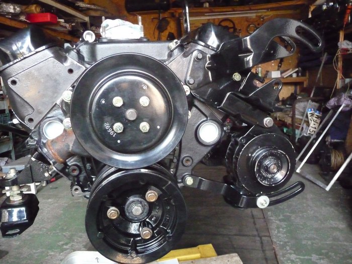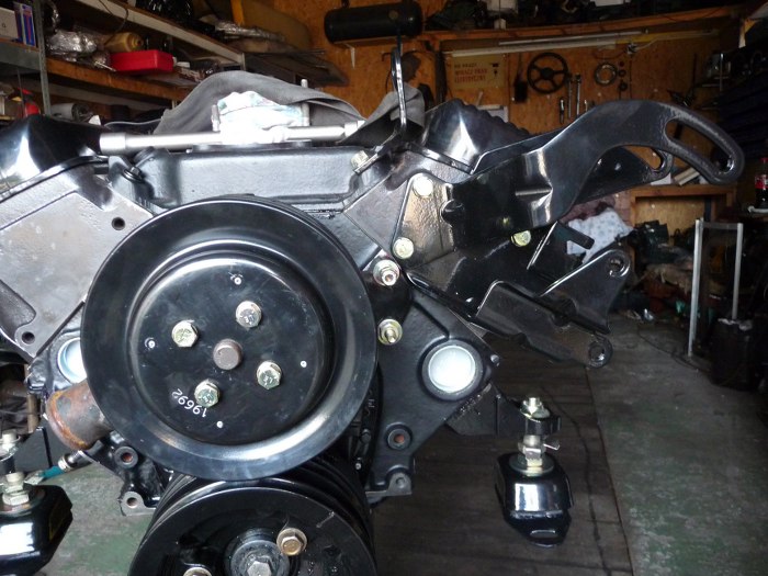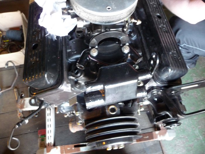 Tu widać jak ładnie się udało doczyścić koło pasowe pompy wody. Odwinąłem też z folii wsporniki alternatora i pompy wspomagania (pompa wspomagania napędza siłowniki hydrauliczne trymu - podnoszenia i opuszczania śruby) i zacząłem kombinować jak je przykręcić.