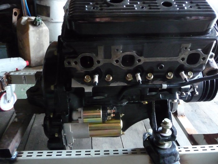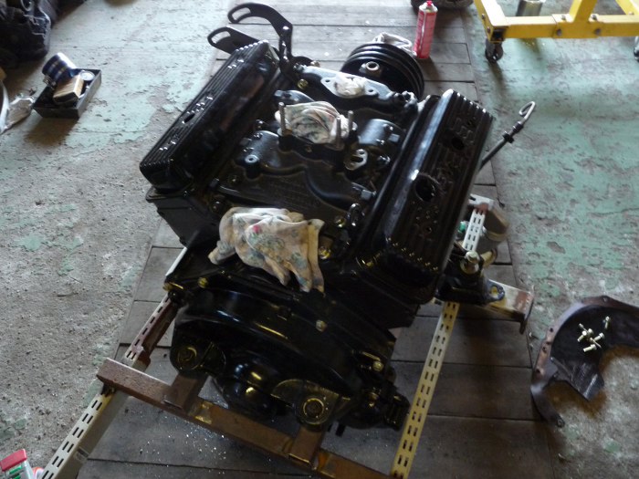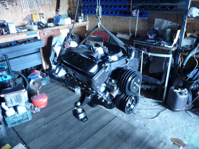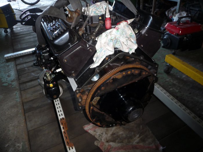 Następnie, po przykręceniu uszu do podnoszenia silnika zdjąłem go wreszcie ze stojaka. Wyciągarka się przydała, bo ciężkie toto...