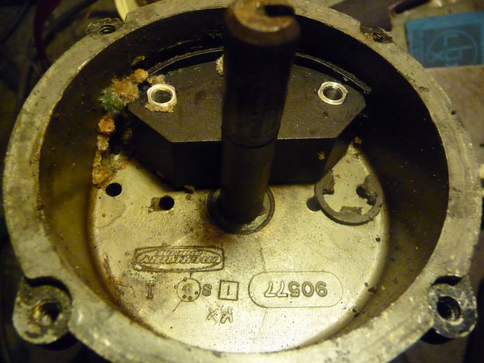 Pompa wody była strasznie zapyziała w środku kamieniem z wody, ale bez luzów, śladów wycieków, łożyska ok; dlatego po wyczyszczeniu od środka i na zewnątrz została użyta ponownie. Ciekawe est to, że ma dwa rozstawy śrób na różne koła pasowe.