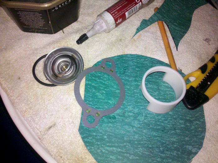 Potem się połapałem, że coś jest nie tak. Silnik się grzał, ale wskaźnik temperatury pokazywał wciąż 0, węże chłodzenia zimne. Okazało się, że złożyłem termostat (samochodowy) tak jak w samochodzie, a tu powinien być inny i inaczej włożony. W takim zastosowaniu silnika termostat wchodzi pod tą tuleję mosiężną.