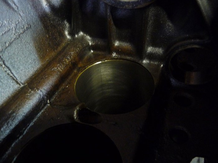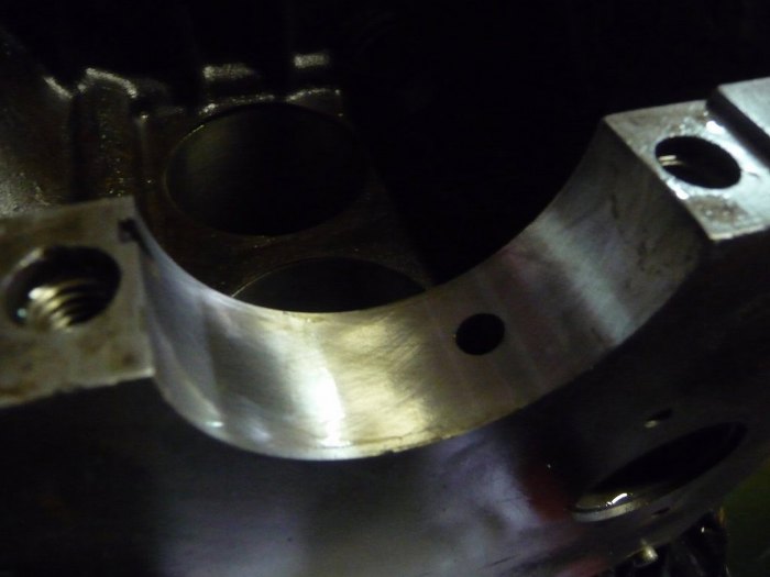 A tu widać ślady honowania cylindra. W zasadzie można by zrobić szlif, ale dość ciężko było znaleźć nowe, pasujące tłoki - ktoś to już kiedyś szlifował i blok jest poza dostępnymi nadwymiarami. Tłoki i gładzie są w miarę ok, więc powinno to działać.