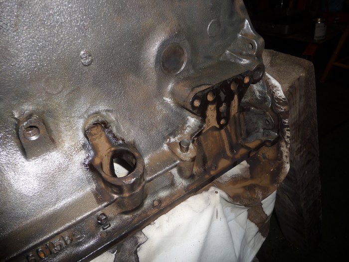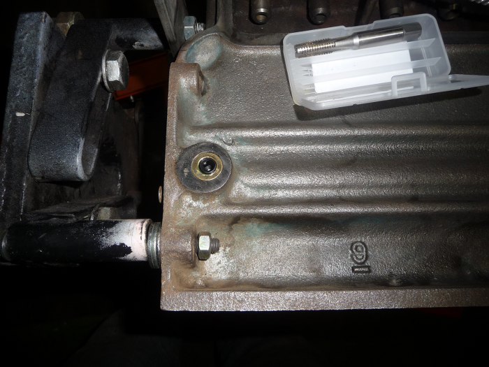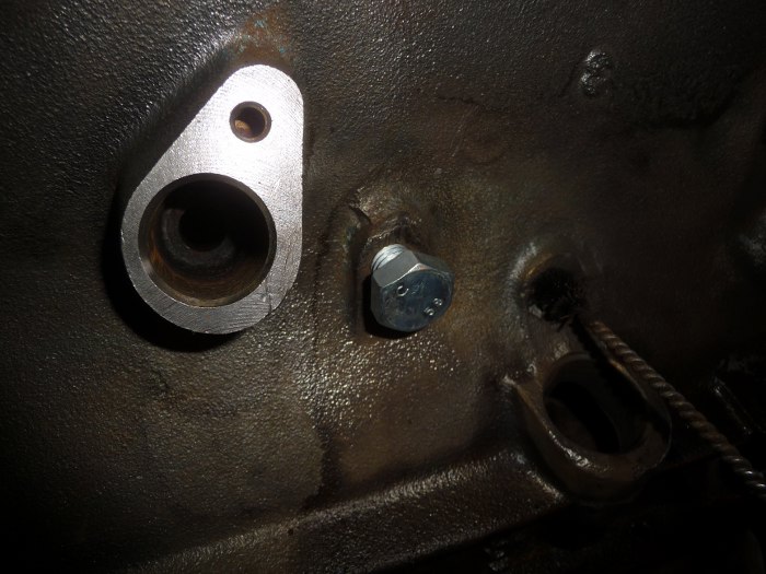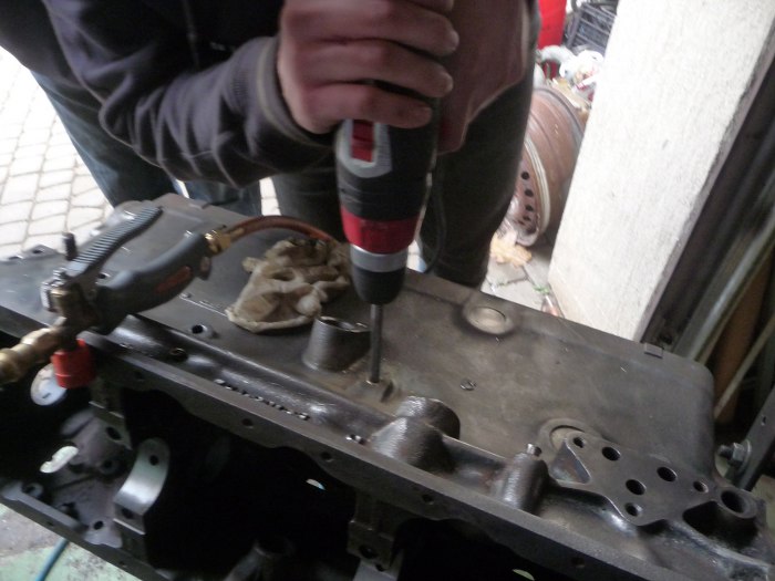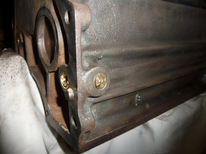 Jak widać jest ich kilka w tym bloku. Fabryka wierciła kanały olejowe od zewnątrz i zamykała je korkami. Stąd łatwo jest znaleźć cały układ olejowy silnika - wystarczy szukać korków. Tu widać już jeden przewiercony, a drugi zmasakrowany podczas prób odkręcenia.