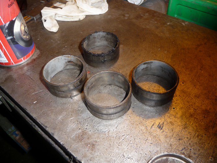 Potem wybiliśmy panewki rozrządu. Jak widać, są również w szlamie olejowym, ale najciekawsze jest to, że kanały olejowe w zewnętrznej części panewek, w połowie ich wysokości, przebiegające przez cały obwód panewek, są doszczętnie zatkane. Dobrze, że to wyjęliśmy.
